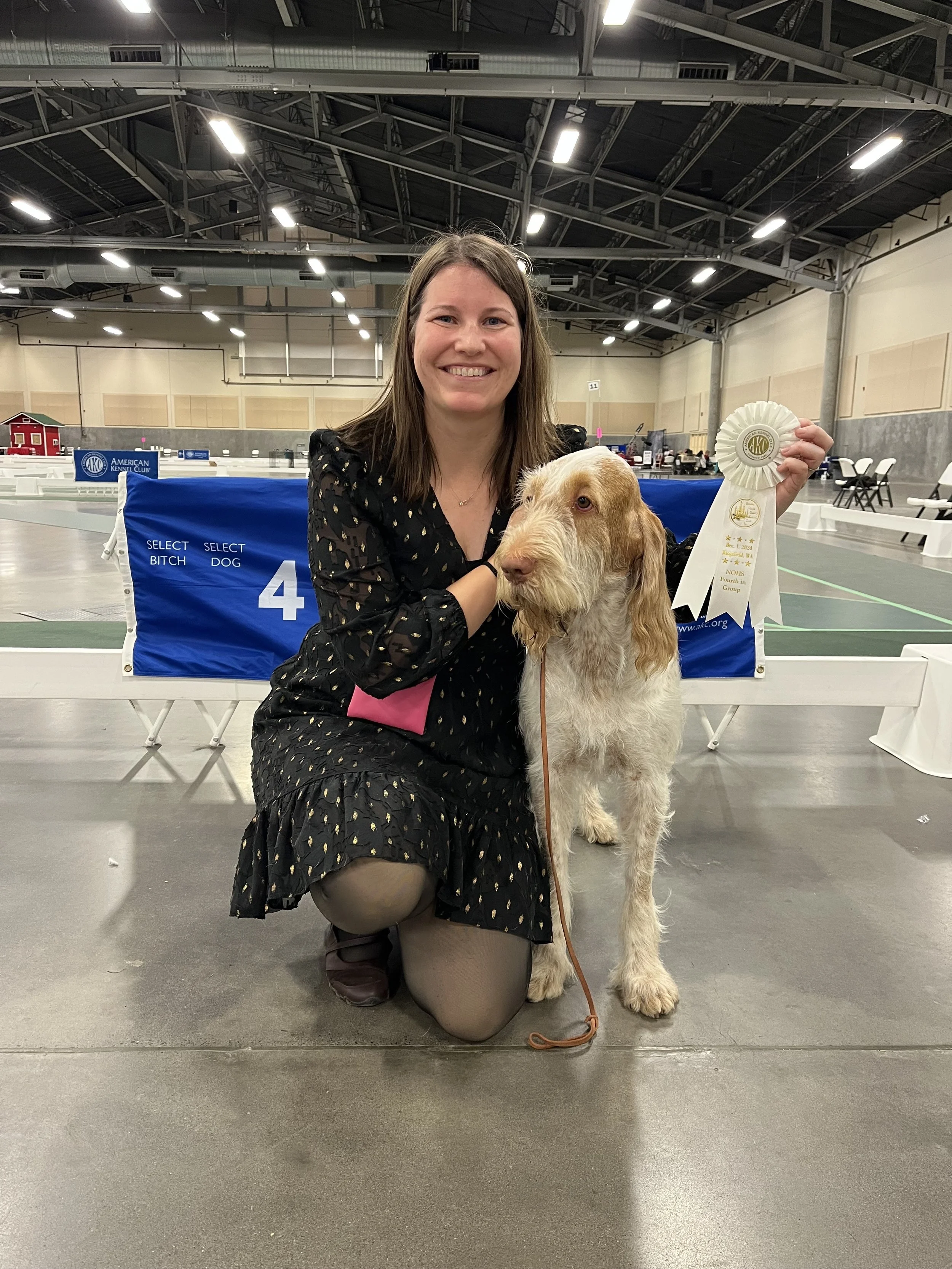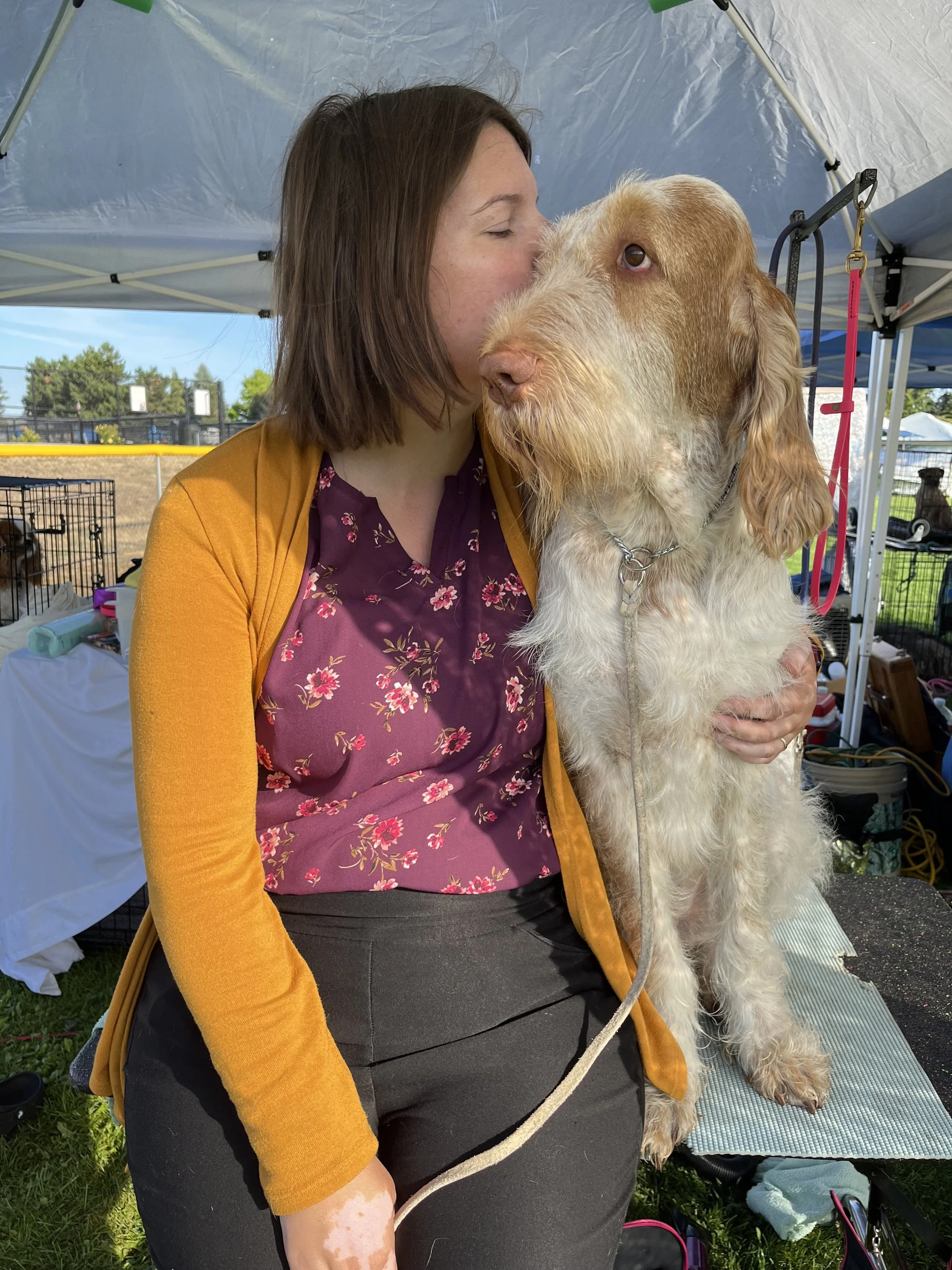 Jenny has one Spinone, named Boo, who is three years old, participates in conformation, and is a registered therapy dog with Pet Partners. Boo has his CGC and Trick Dog Novice titles as well. Her dog family is rounded out by Walter, a two-year-old Cavalier King Charles Spaniel (also a therapy dog), and Remy, a one-year-old Clumber Spaniel who competes in conformation and is also now a therapy dog.